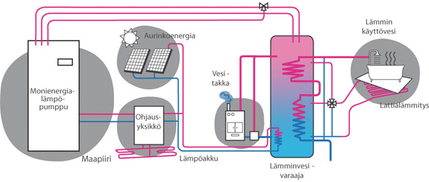 Monienergialämpöpumppu (MELP) pystyy hyödyntämään talon, tuloilman sekä käyttöveden lämmitykseen useita energialähteitä.